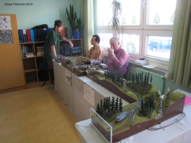 Der Modelleisenbahnclub Oranienburg war mit Hüttenrode gekommen. Das ist wirklich eine Ausstellungsanlage; zwei Bediener vorn und zwei hinten machen abwechselungsreichen Betrieb und streiten sich auch schon mal ein wenig.