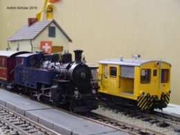 Hier ist eine Ge 6/6 oben angekommen mit zwei grünen Wagen von Achim