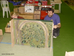 Aus Jena kam eine große TT-Anlage. Da war auch Eisenbahn drauf, aber sonst ganz viel Landschaft. Es sah ganz so aus, als ob die Landschaft vor der Eisenbahn da war.