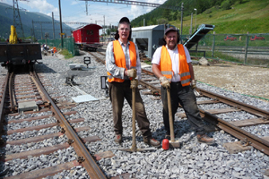Die beiden Spezialisten haben schon ein Sicherheitszeichen im Bahnhof Realp auf ihrem Kerbholz. |
