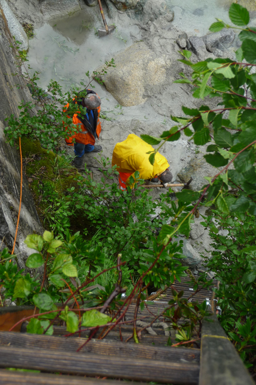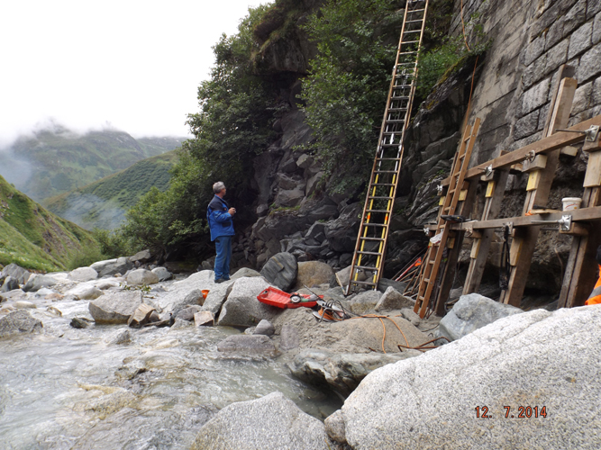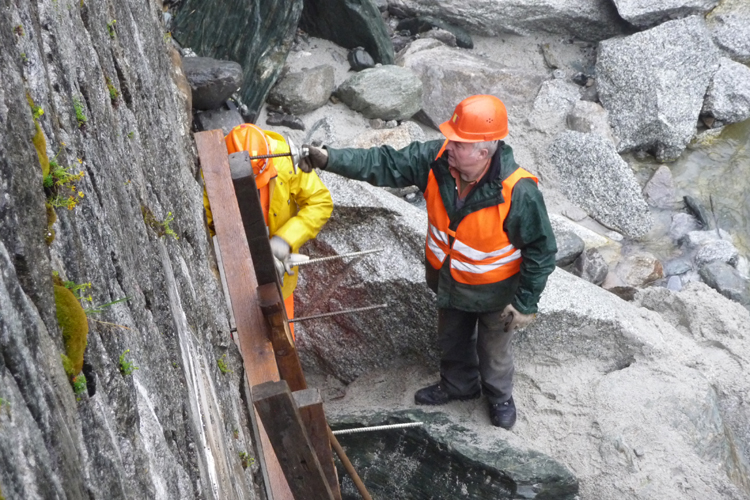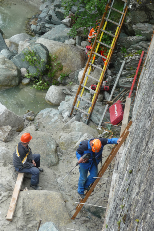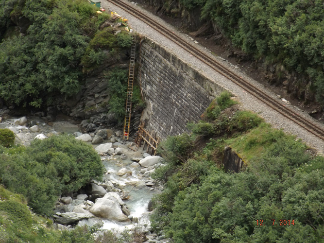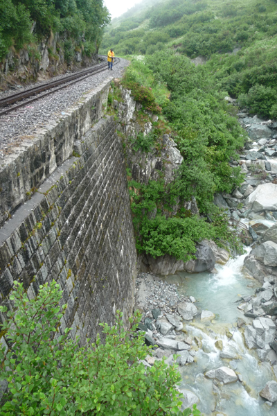 Das findet zu Fuß der Bahn statt. Die Furka-Reuss hat sich unter dem Fundament der Stützmauer zu schaffen gemacht. |