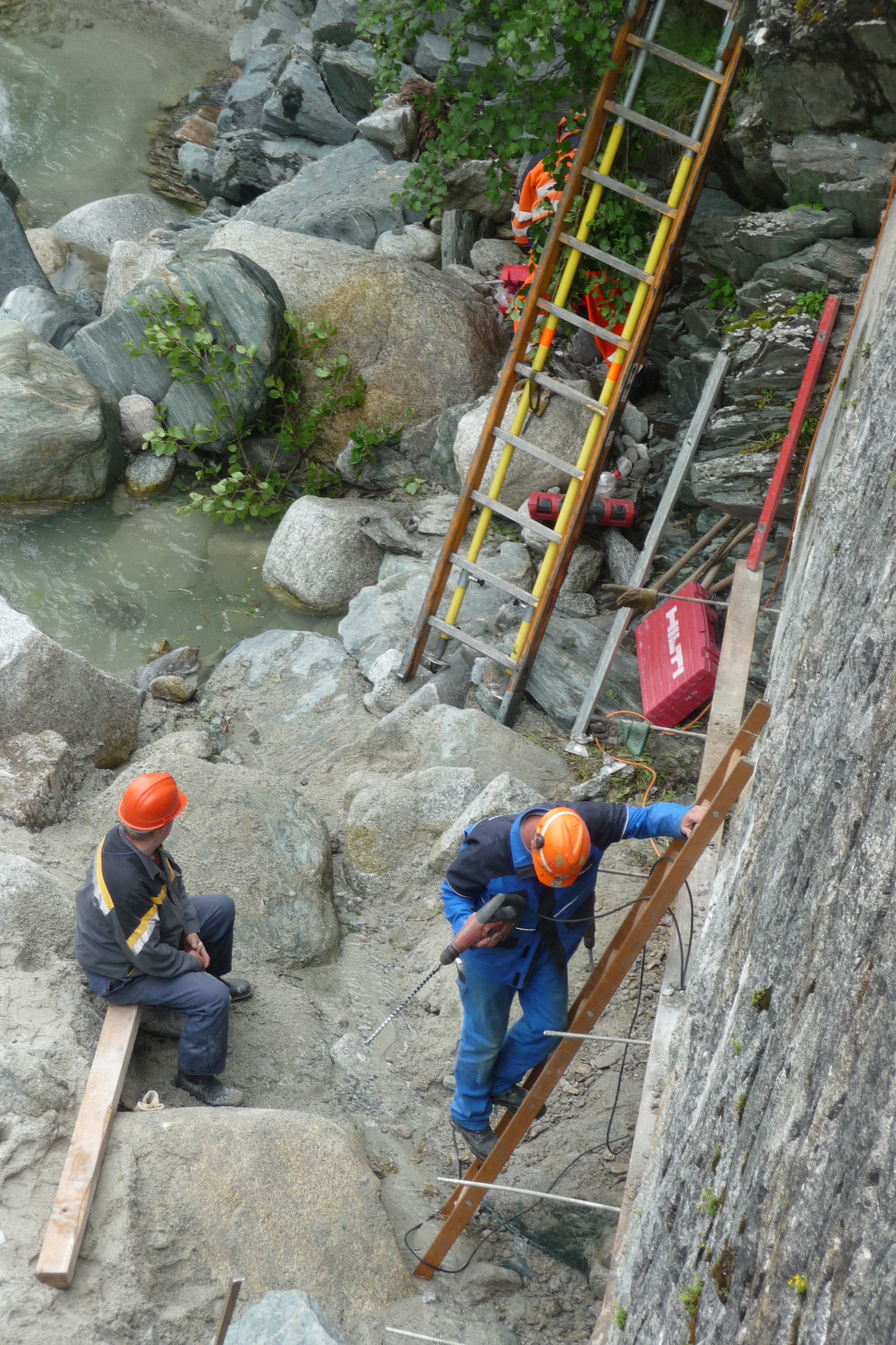 | Die Aufgabe: Vorbereiten der Beton-Schalung für eine Unterschüttung des Fundamentes. Es müssen mit Spannstählen befestigte Balken montiert werden. Unten ist Helmpflicht, damit Herunterfallendes keine größeren Schäden anrichtet. |