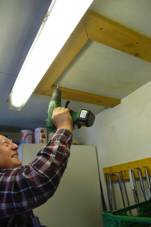 Station Furka, Einbau einer Zugangsklappe in der Decke der Küche.