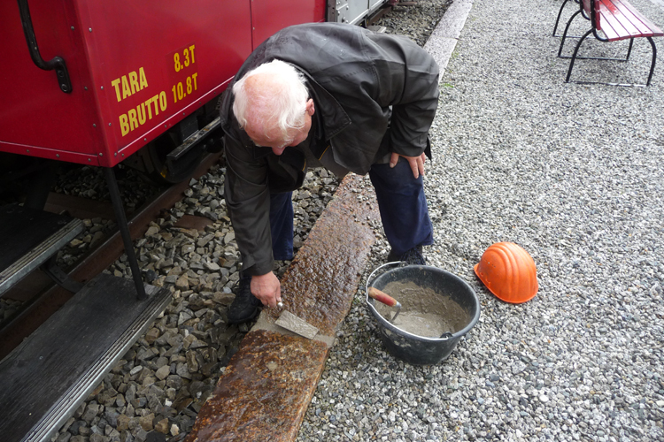 Dieter Frisch übt sich in der Kunst der Fuge: Am Bahnhof DFB in Realp waren Fugen zu bearbeiten.